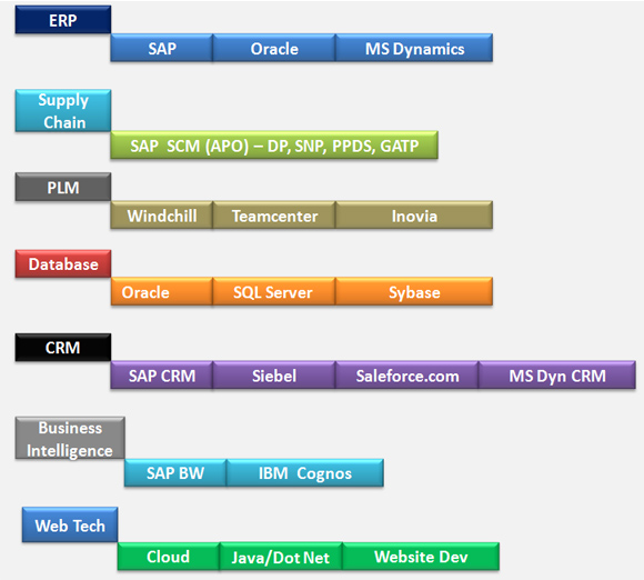 Our Solution portfolio include: ERP, Supply Chain, PLM, Database, Business Intelligence, CRM and Web Technologies.